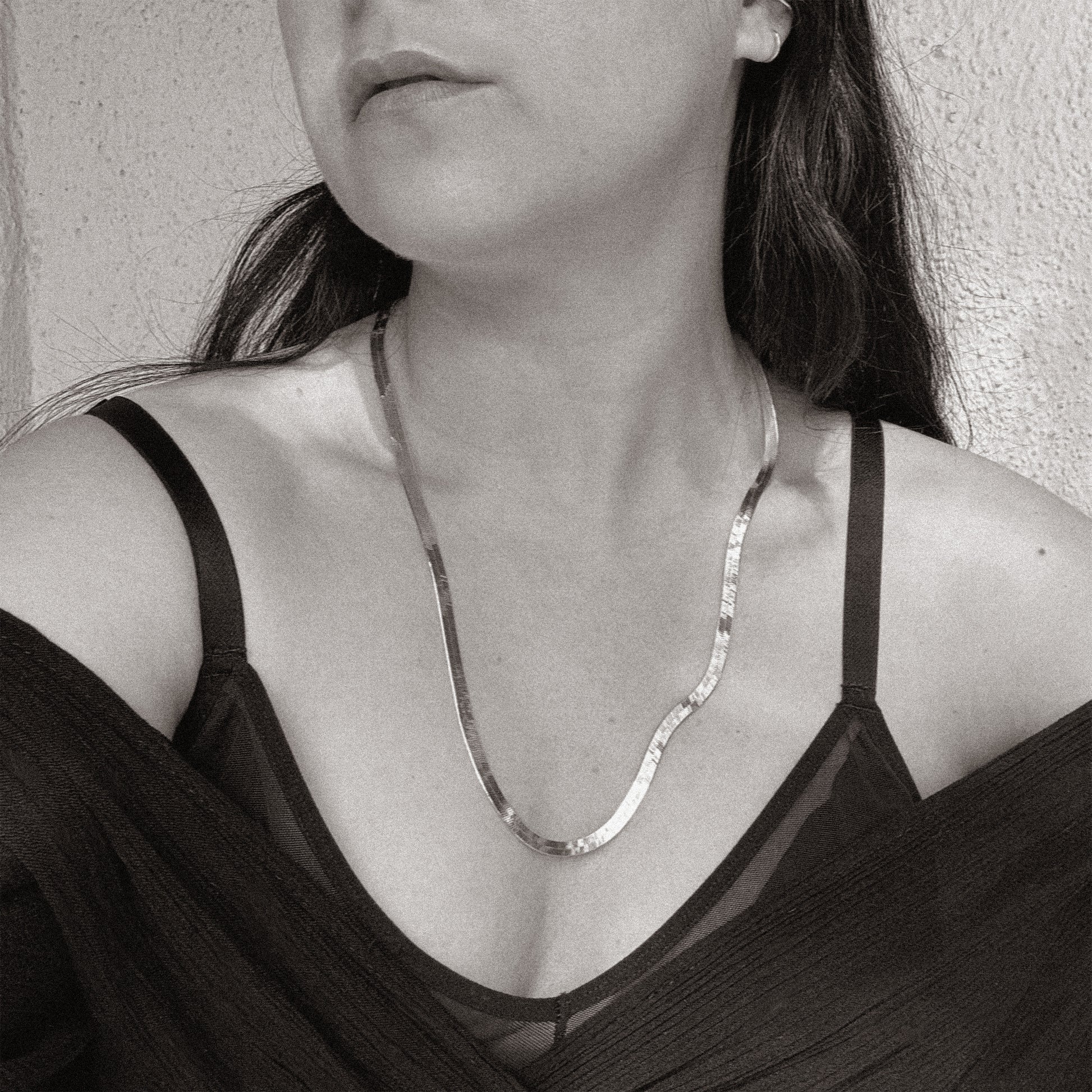 The Vintage Silver Liquid Herringbone Necklace is beautifully crafted in solid sterling silver. Catches the light in the most dreamy way!