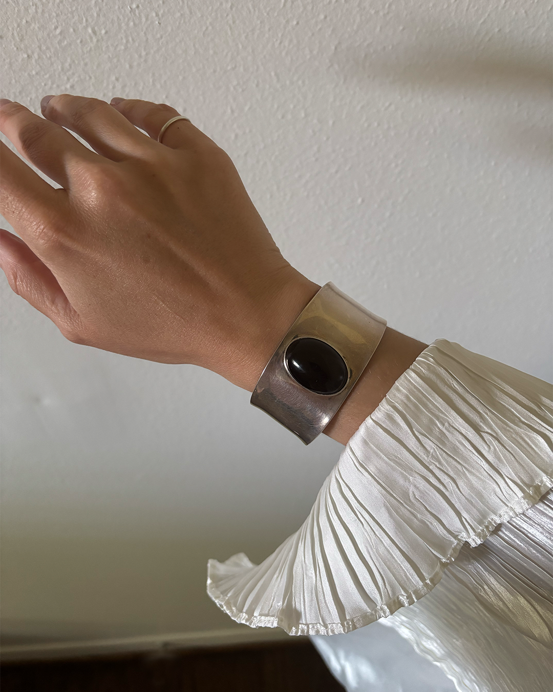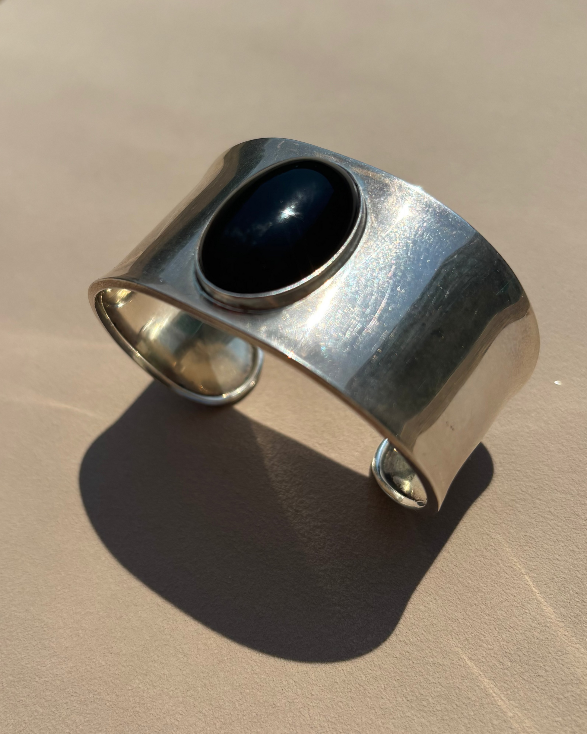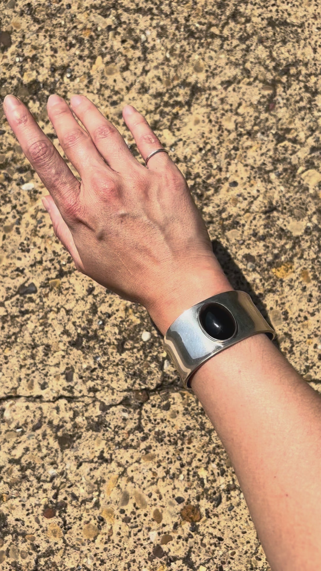 Bold and timeless, this vintage sterling silver cuff features a striking oval onyx cabochon set in a wide, sculptural band. The minimalist design highlights the deep black stone, adding an elegant edge to any ensemble. A classic statement piece with enduring style.