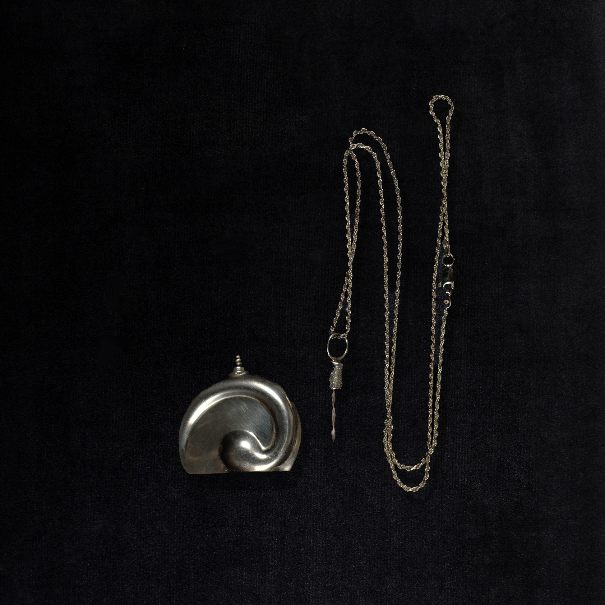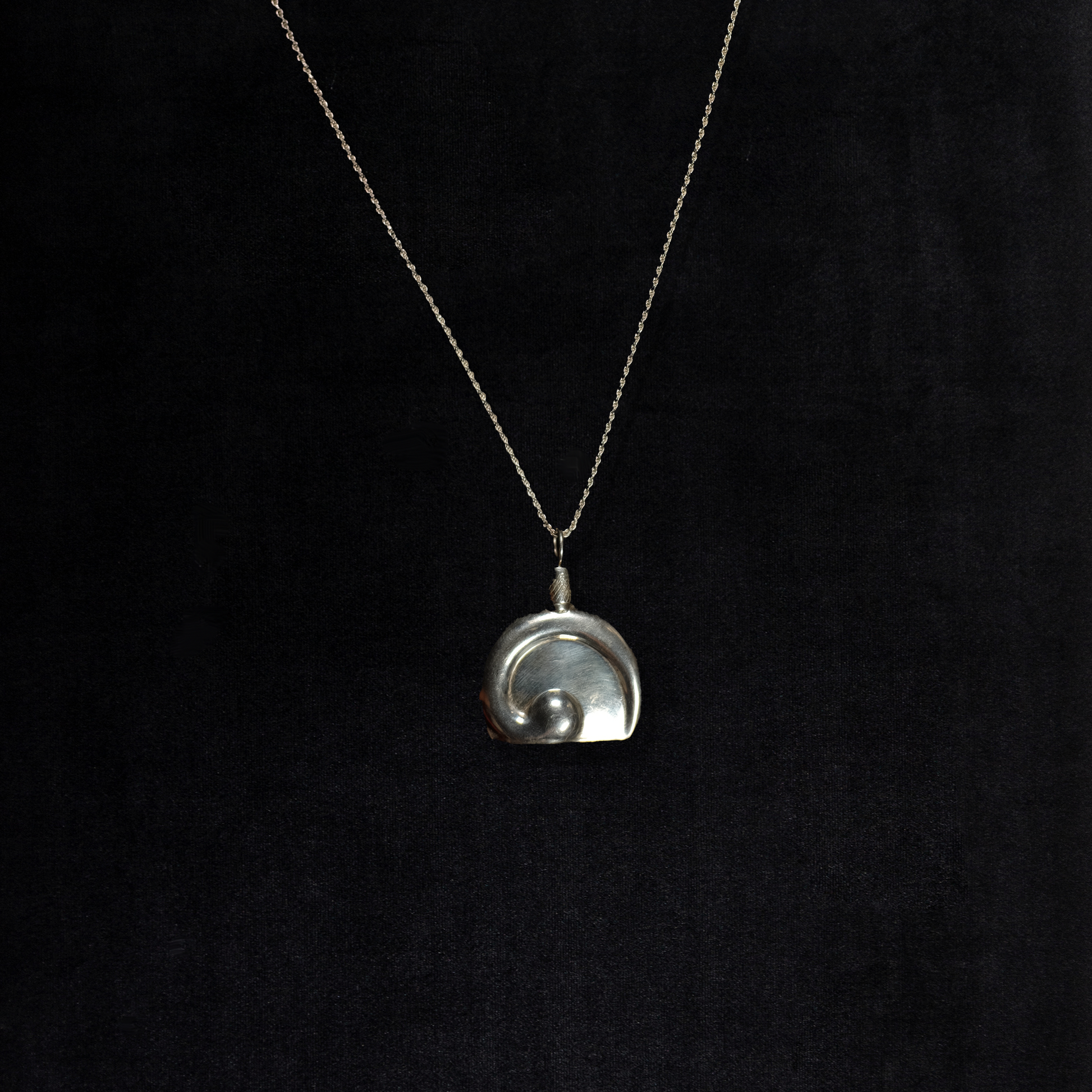 A rare statement piece with purpose — this vintage sterling silver necklace features a bold, sculptural perfume pendant in a swirling, modernist form. Measuring a striking 2 inches, it opens to hold fragrance inside, blending wearable art with ritual. Suspended from a twisted rope chain, this piece is both functional, collectible, and unforgettable.